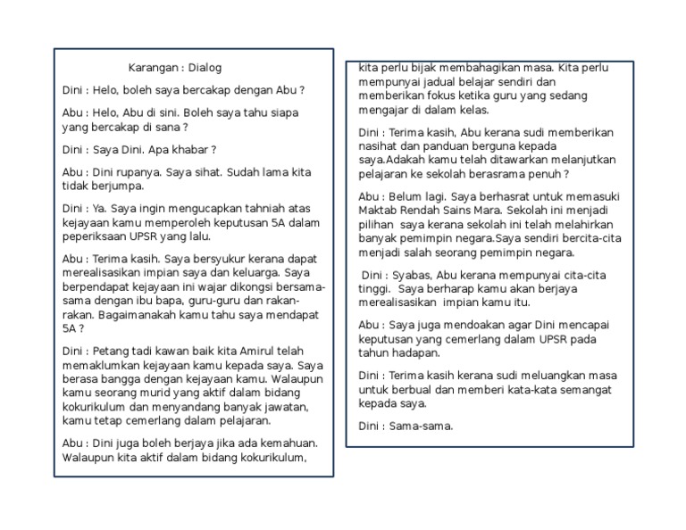 Karangan Dialog Usaha Tangga Kejayaan Jaycectzx Dahlia tetap mengutamakan pelajarannya dengan meminjam nota dan bertanyakan kepada Kavita dan Siti Wangi walaupun terpaksa. Contoh karangan dialog usaha tangga kejayaan soalan and jawapan. Cogan kata usaha tangga kejayaan sudah menjadi sinonim dalam diri rakyat malaysia tidak.